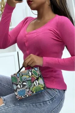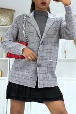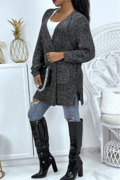 Gilet Mi-long Noir Argenté Pailleté Fendu Sur Les Côtés En Mailles Avec Manches Bouffantes