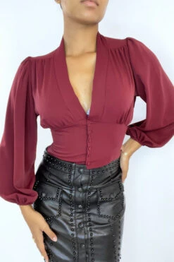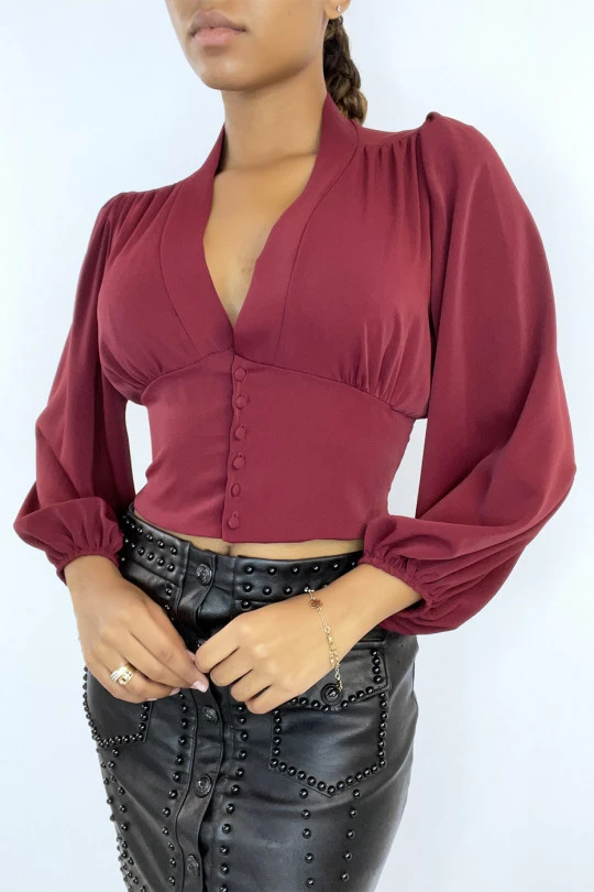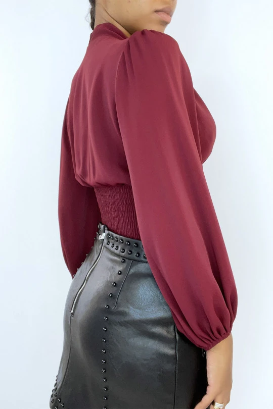 Blouse bordeaux cintrée à la taille avec décolleté et manches bouffantes. Haut pas cher crop top pour femme.