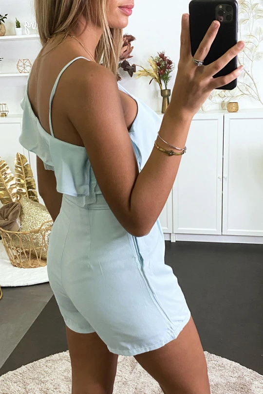 Combi-short bleue croisĂ© au buste avec volant et dentelle. Mode femme pas cherÂ