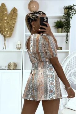 Combi-short cache coeur taupe satinée à imprimé floral et ceinture à la taille