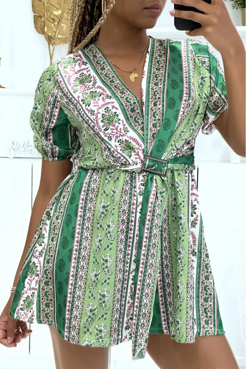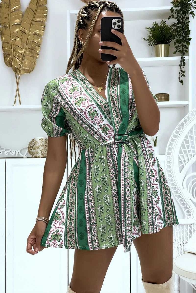 Combi-short cache coeur verte satinée à imprimé floral et ceinture à la taille