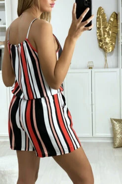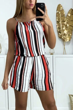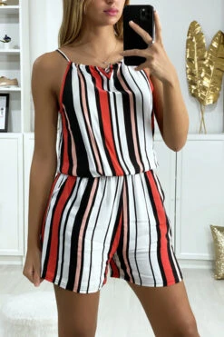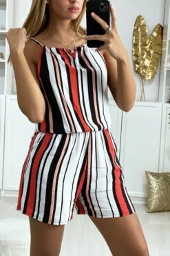 Combi-short rayĂ© rose blanc noir en coton avec lacet au bretelle. VĂŞtement femme pas cherÂ