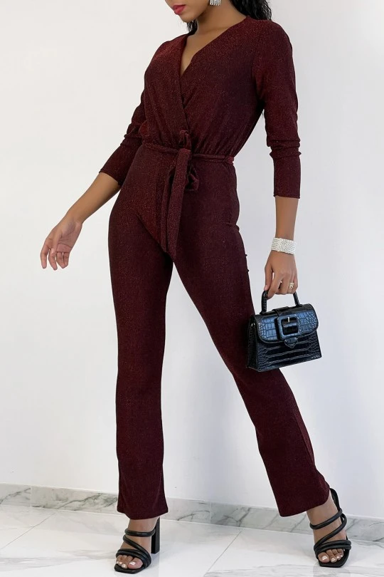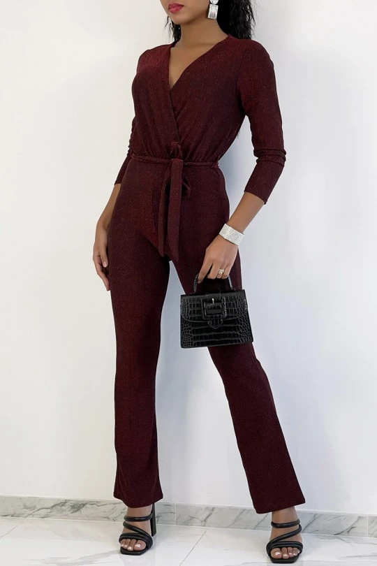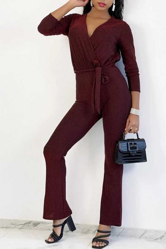 Combinaison cache-coeur rouge à paillettes pantalon évasé. Combinaison brillante en matière stretch très confortable et pantalon évasé, idéale pour les fêtes.