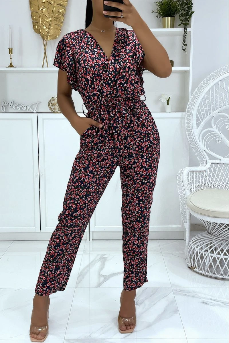 Combinaison marine motif fleuris très chic avec poches et ceinture