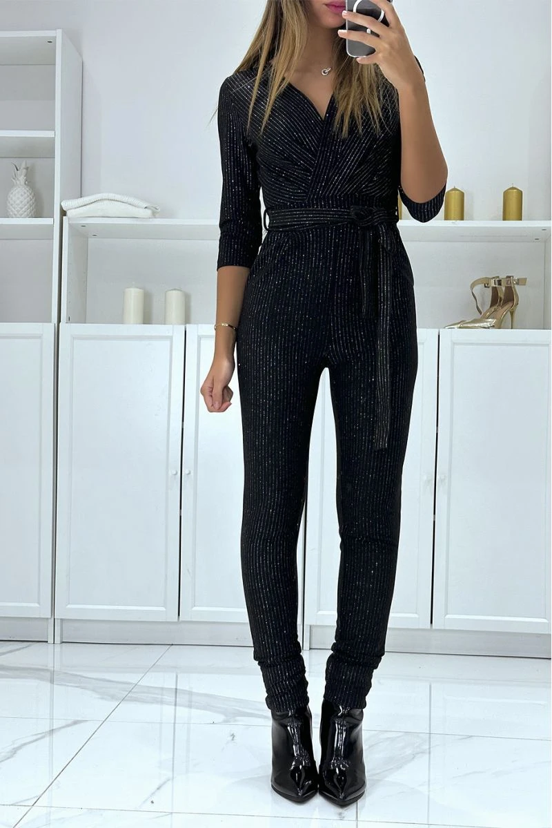 Combinaison noire de soirée à rayure argenté et col cache coeur