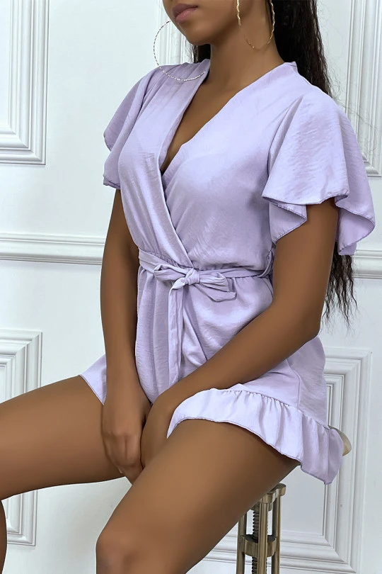 Combishort lilas en voilage à volant, col cache coeur et attache