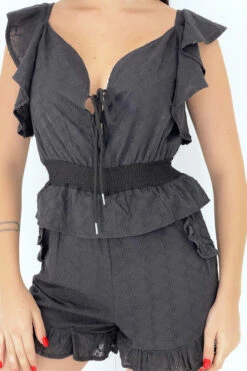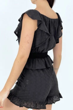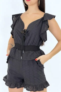 Combishort noir à volants et détails ajouré style bohème. Combo-short d’été légère avec décolleté V à nouer.