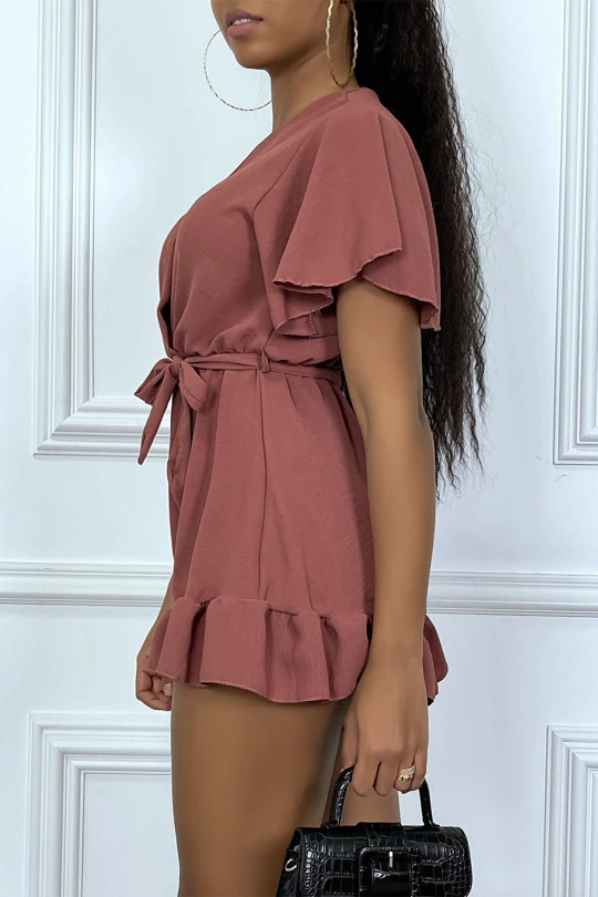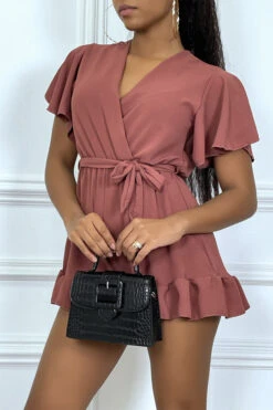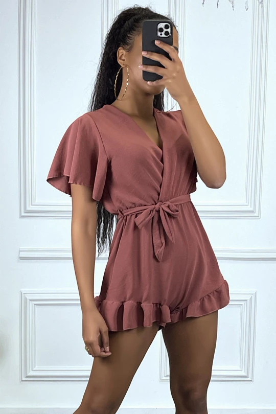 Combishort rose foncée en voilage à volant, col cache coeur et attache
