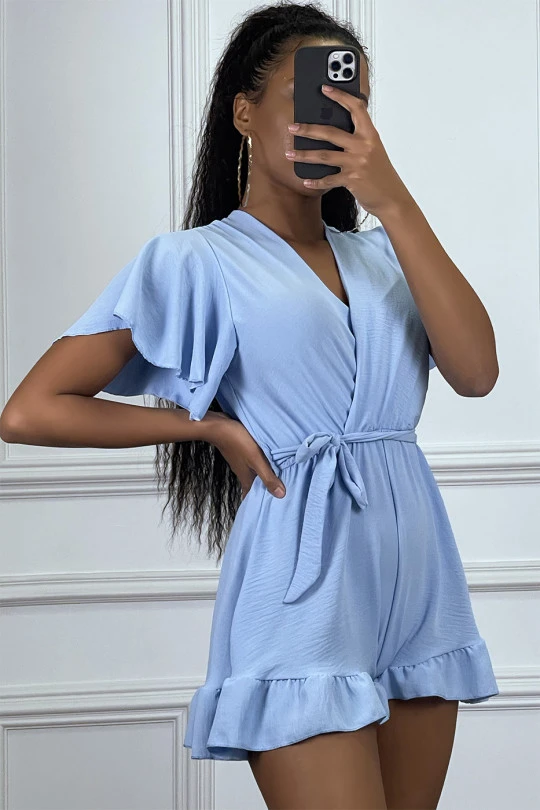 Combishort turquoise en voilage à volant, col cache coeur et attache