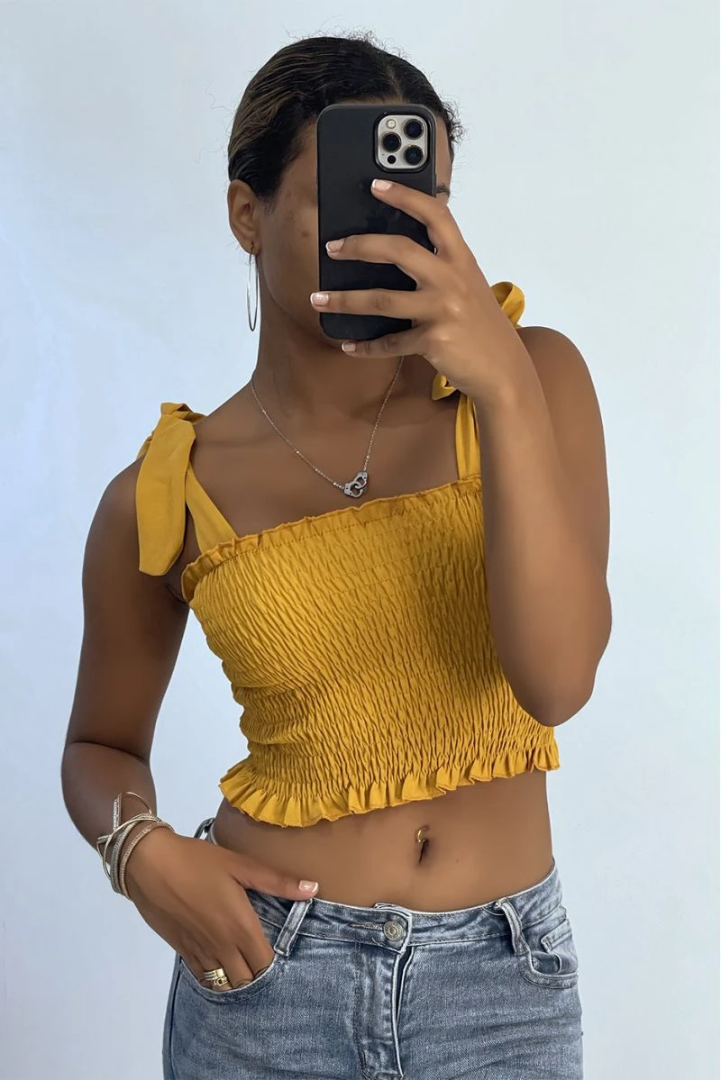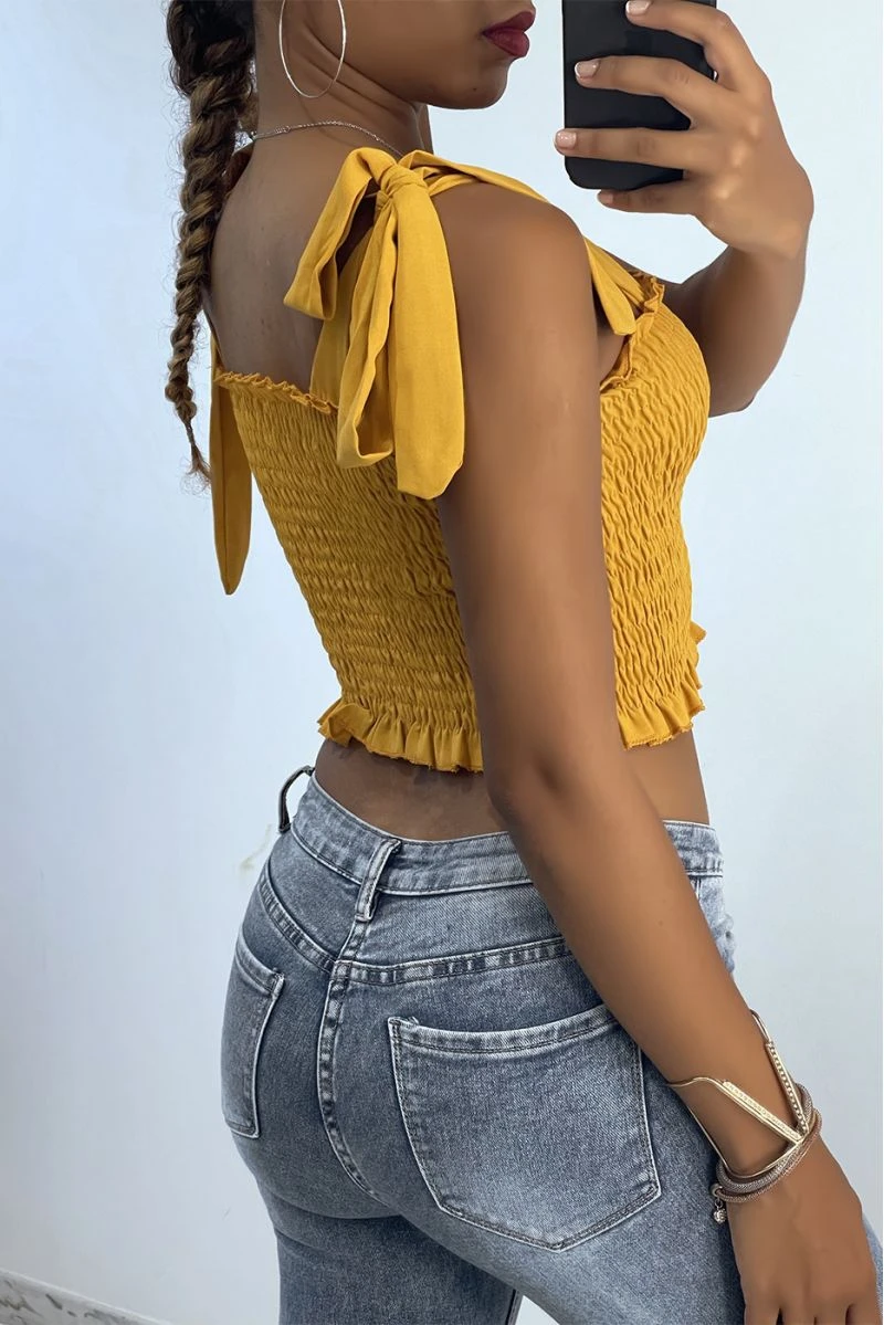 Crop top bustier froncé moutarde avec bretelle à nouer