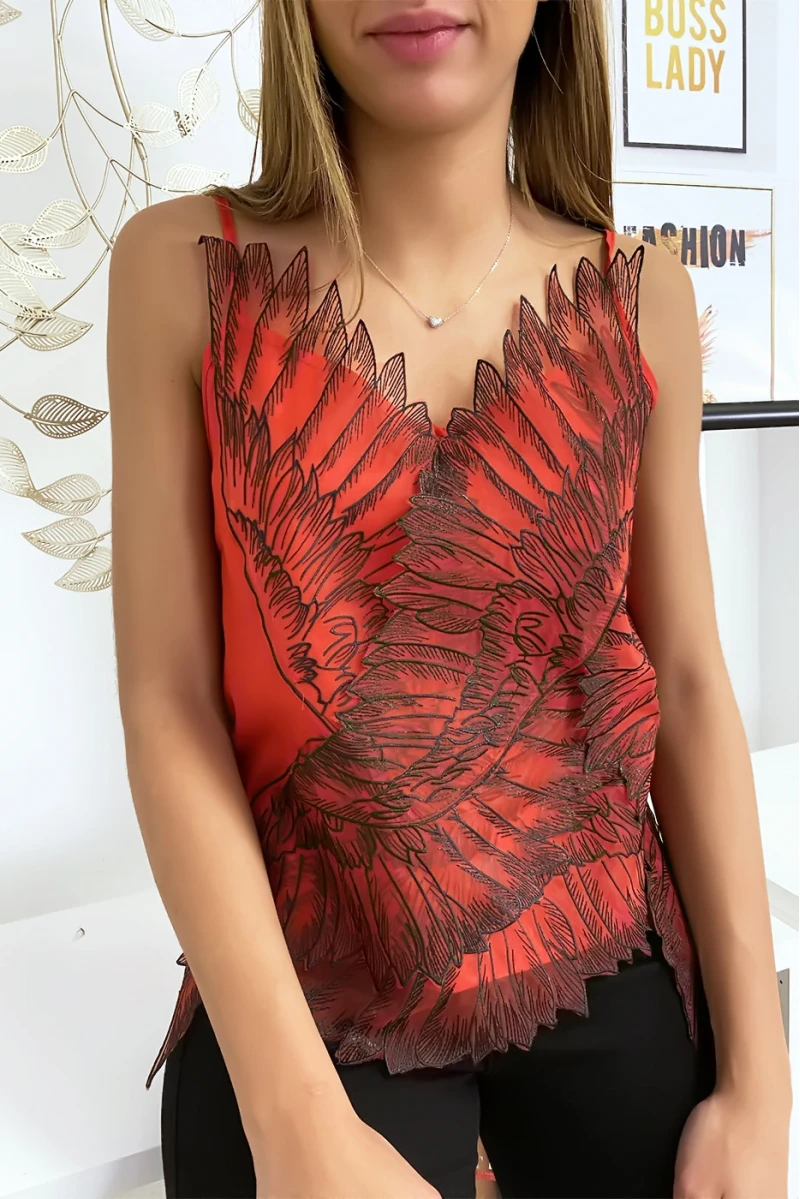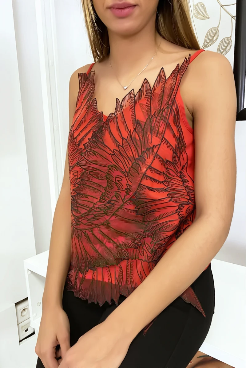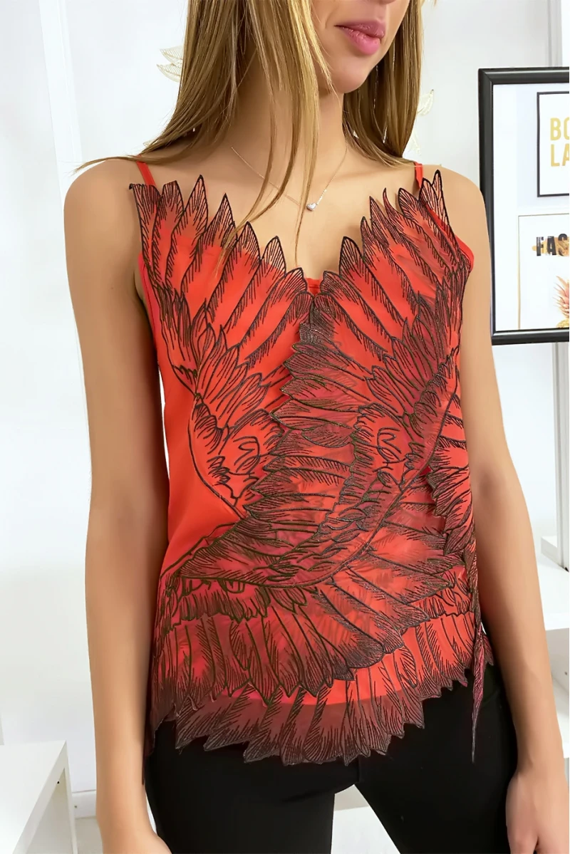 Joli débardeur rouge pour femme avec tulle brodé à l’avant en forme d’ailes. Top d’été pour femme à petit prix