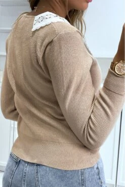 Gilet beige à col Claudine. Gilet côtelé style petit pull vintage