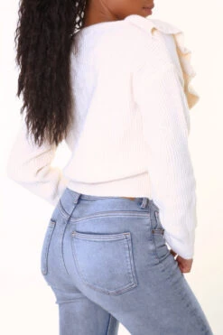 Gilet court beige chaud et doux Ă volants. Gilet col V effet bouffant et style vintage hyper tendance.Â