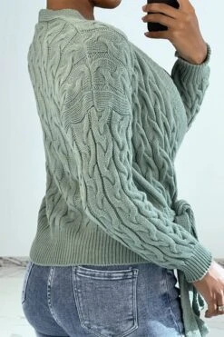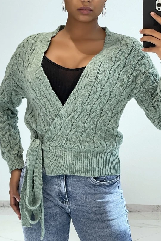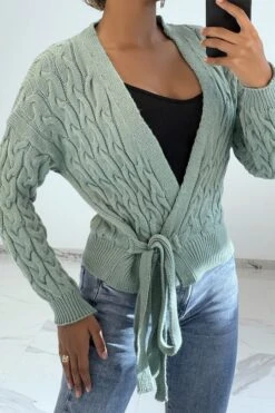 Gilet vert d’eau en grosse maille cache coeur avec col V. Gilet Ă maille torsadĂ©e super tendance pour femme.
