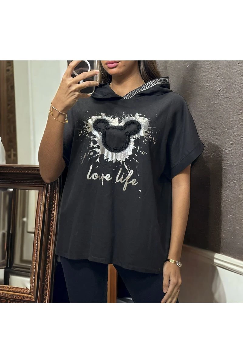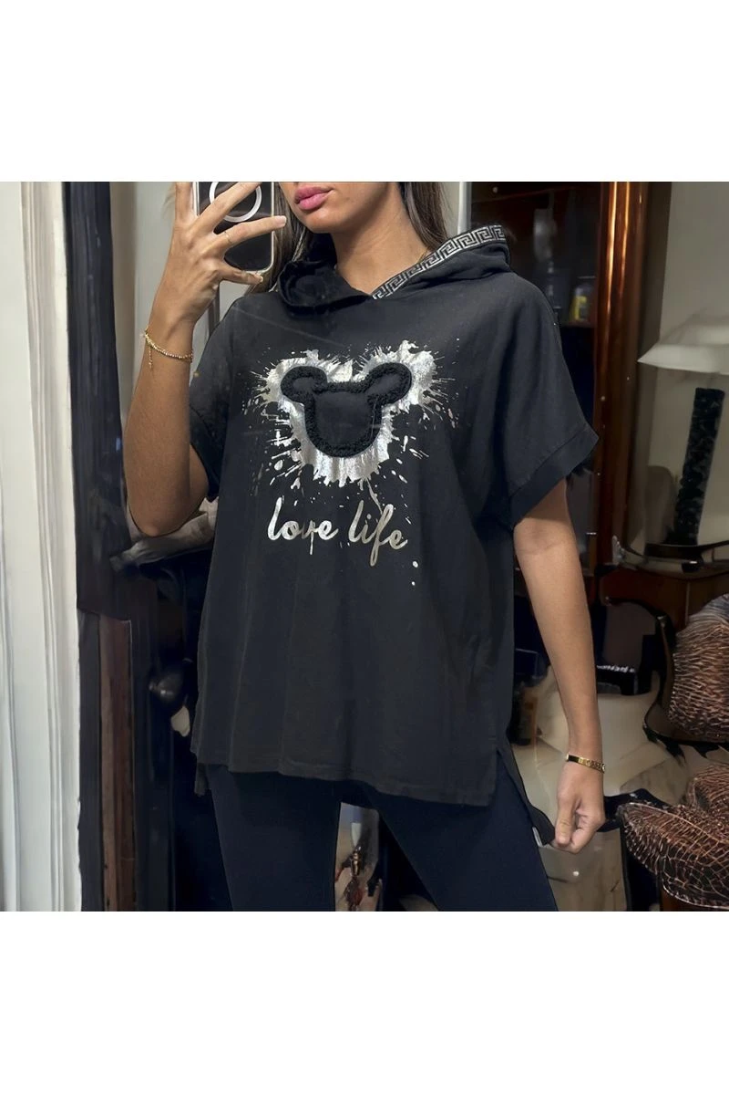 Haut à capuche en lin coton noir avec dessin argenté à l’avant