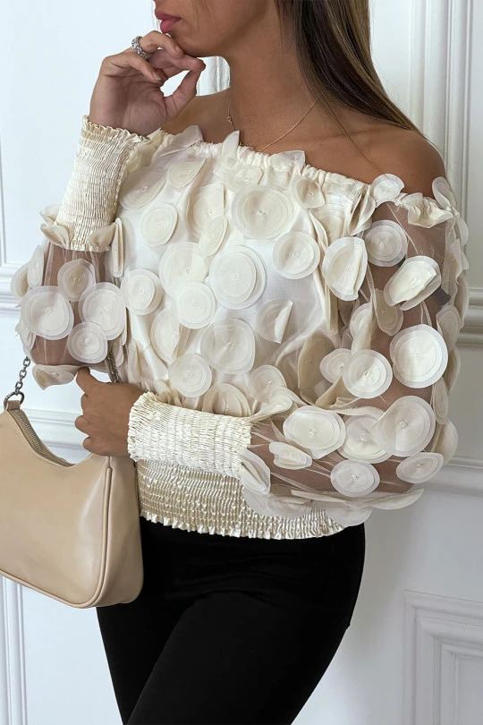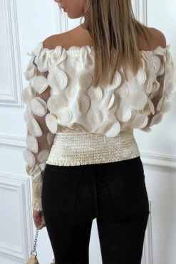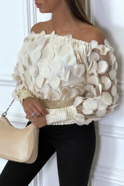 Haut beige col bateau avec taille élastique et motif satiné. Top femme col bateau doublé et satiné très tendance et chic