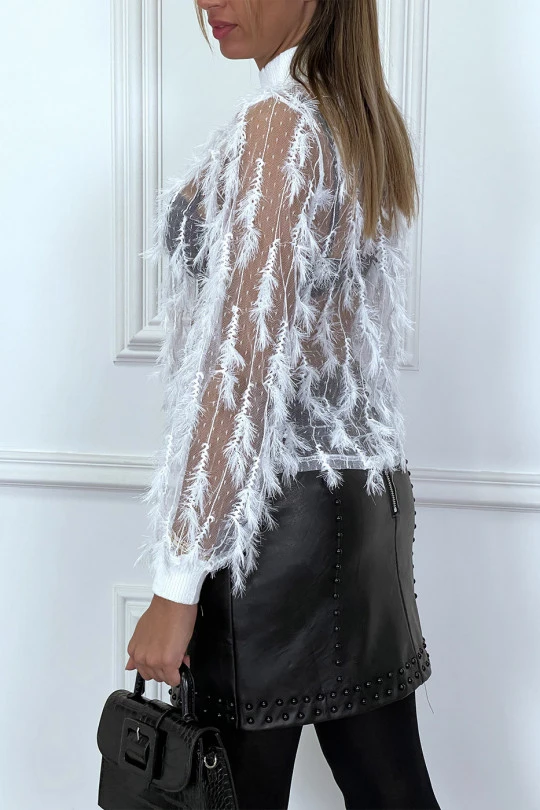 Haut blanc en résille brodé avec col roulé et manches côtelés. Haut pour femme très tendance et sexy à porter avec un joli blazer noir et un pantalon slim pour avoir une allure de top modele