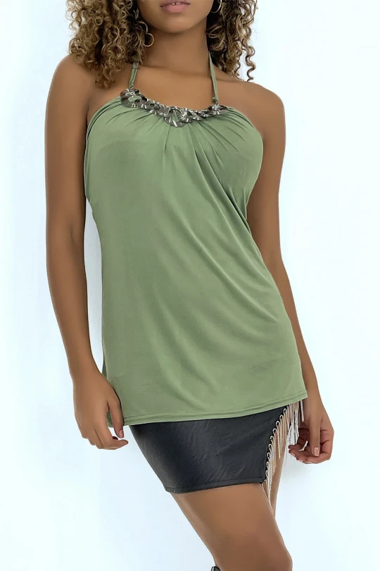 Haut dos-nu kaki à effet froncé. Top fluide et long à empiècement argenté style bohème.