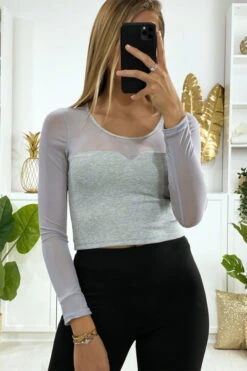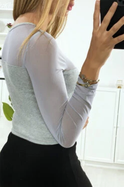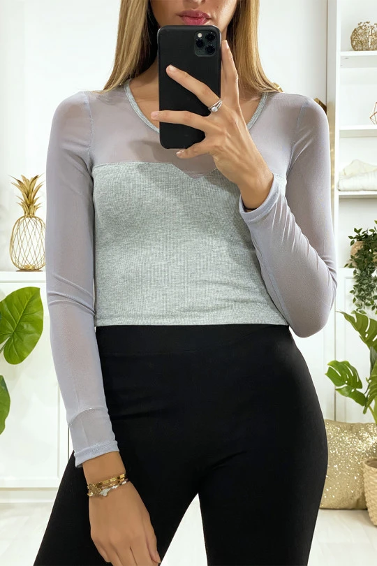 Haut gris pour femme en maille côtelé avec résille au buste et aux manches. Mode femme fashion