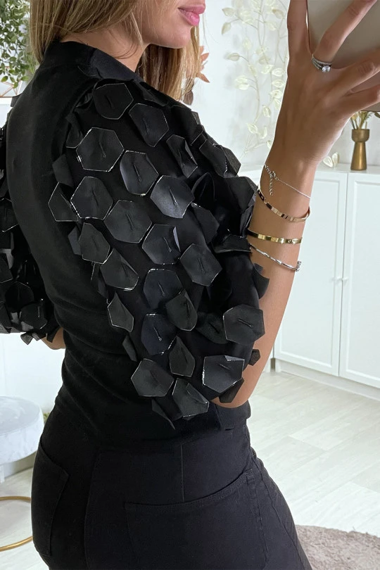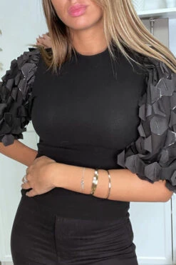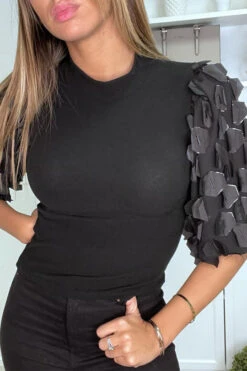Haut noir avec manches bouffante en pĂ©tale. VĂŞtement mode femme fashion et tendanceÂ