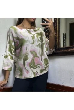 Haut over size manche chauve souris beige motif militaire en maille tricot