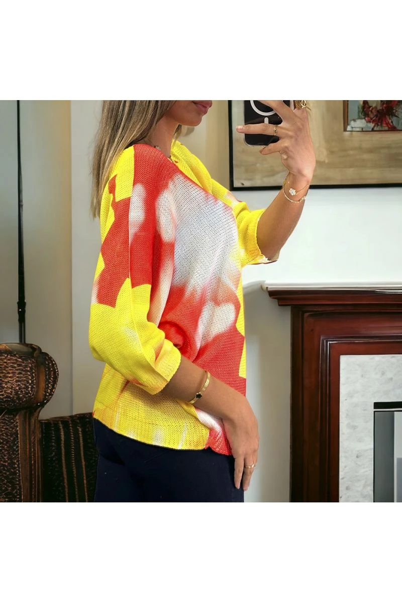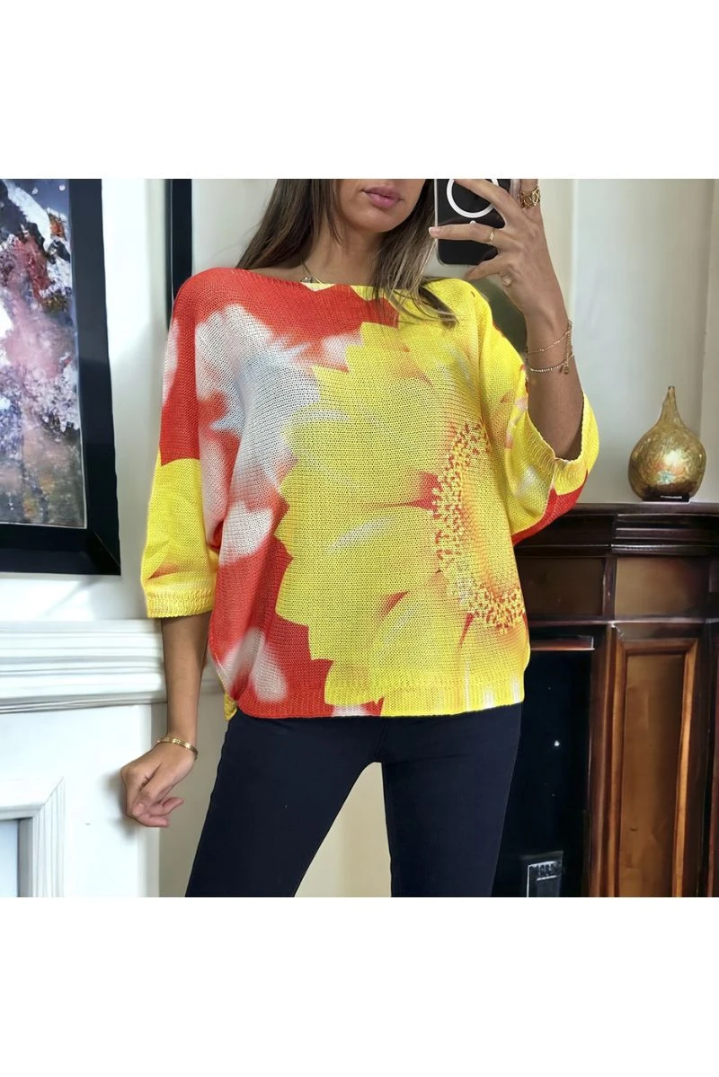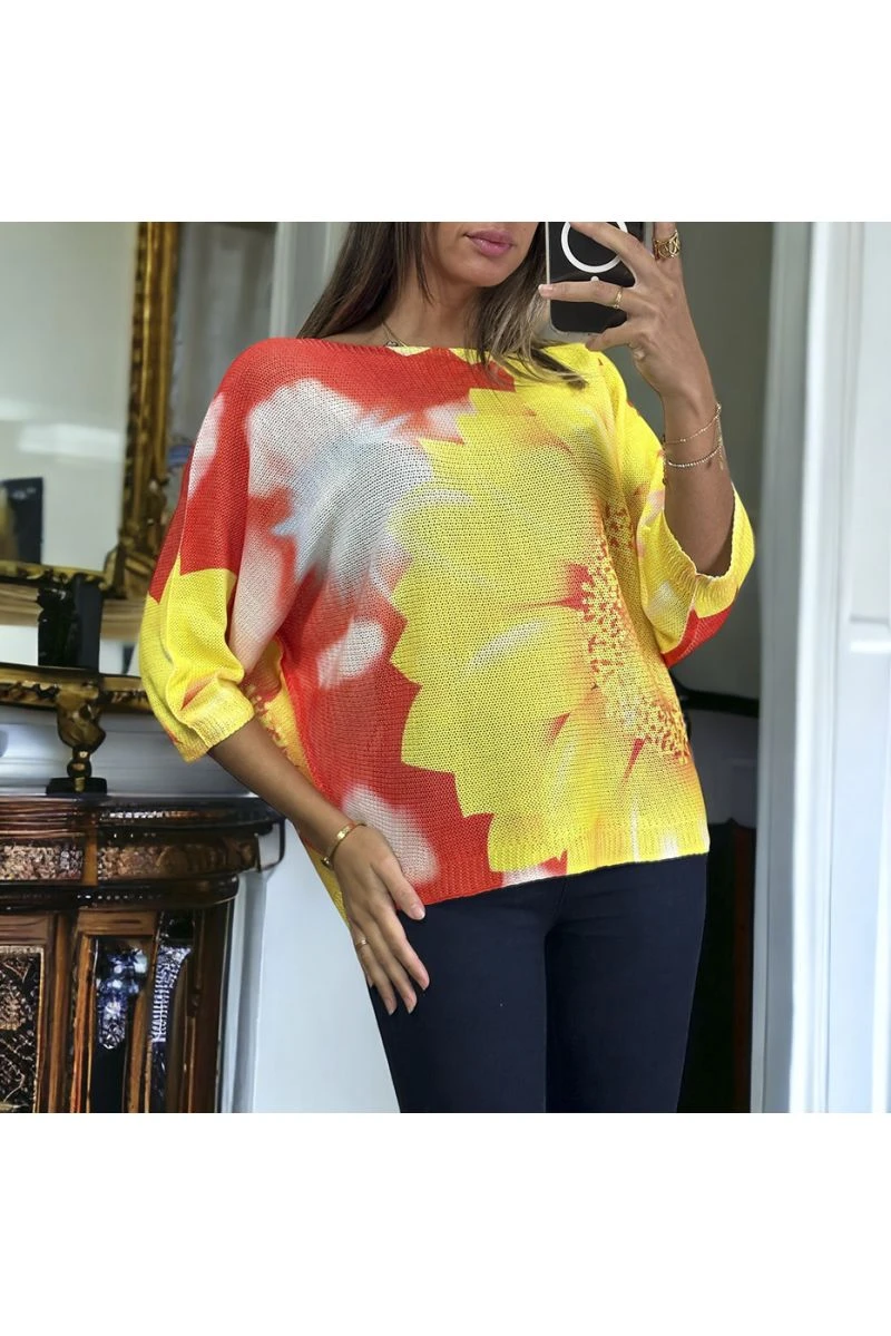 Haut over size manche chauve souris jaune avec joli motif fleur