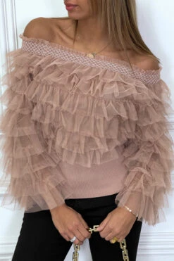 Haut rose bi matière à volants froufrou et col bardot, ce haut très classe est idéal pour vos soirées et évènements.