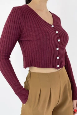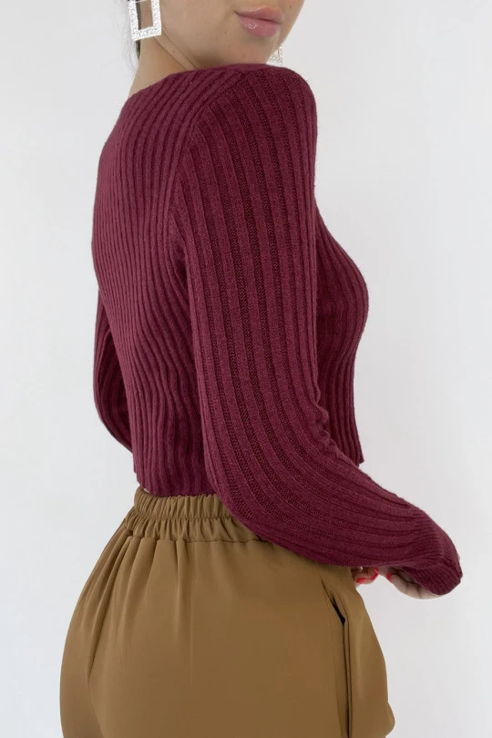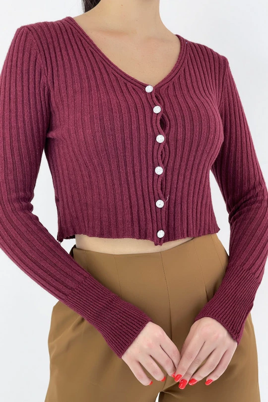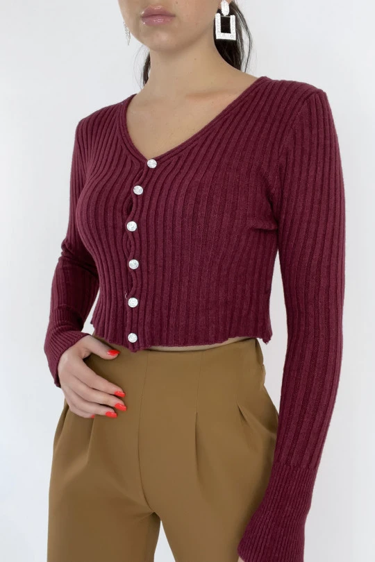 Joli gilet bordeaux côtelé court avec boutons brillants. Gilet doux super tendance pas cher pour femme.