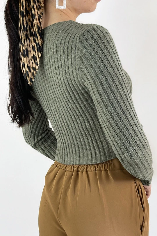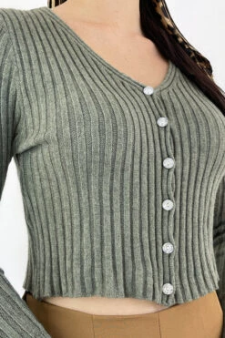 Joli gilet kaki côtelé court avec boutons brillants. Gilet doux super tendance pas cher pour femme.