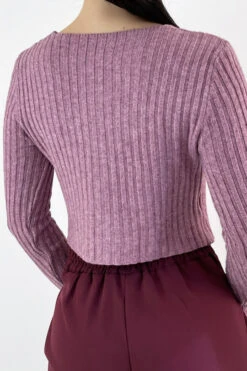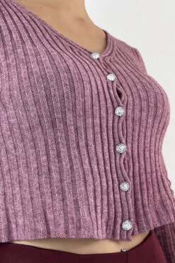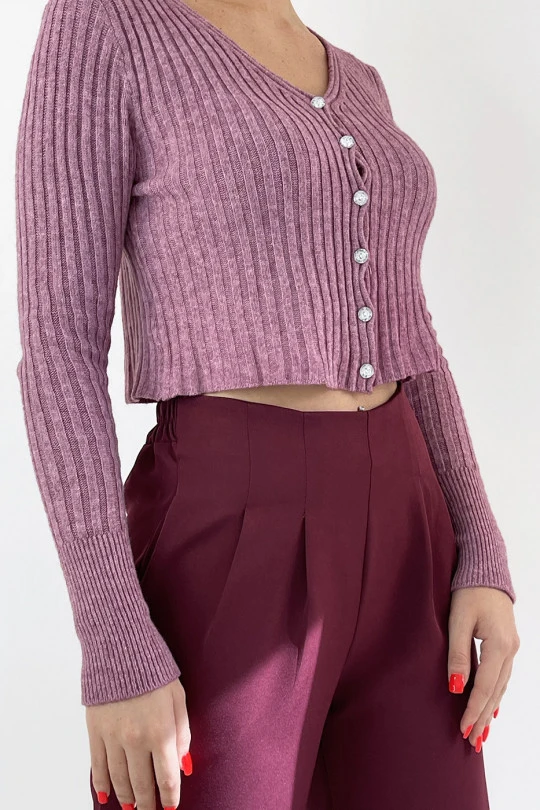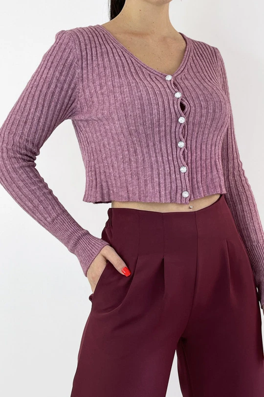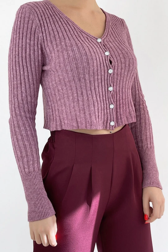 Joli gilet lila côtelé court avec boutons brillants. Gilet doux super tendance pas cher pour femme.