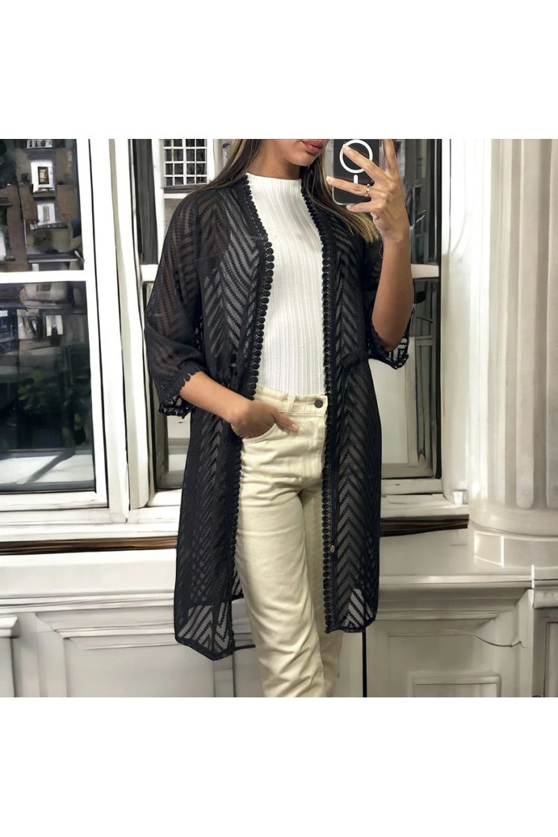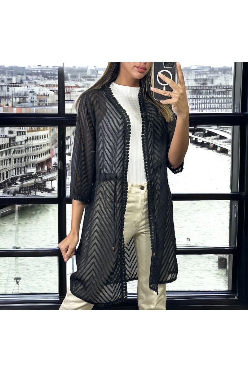 Kimono en voile brodé noir ajustable à la taille