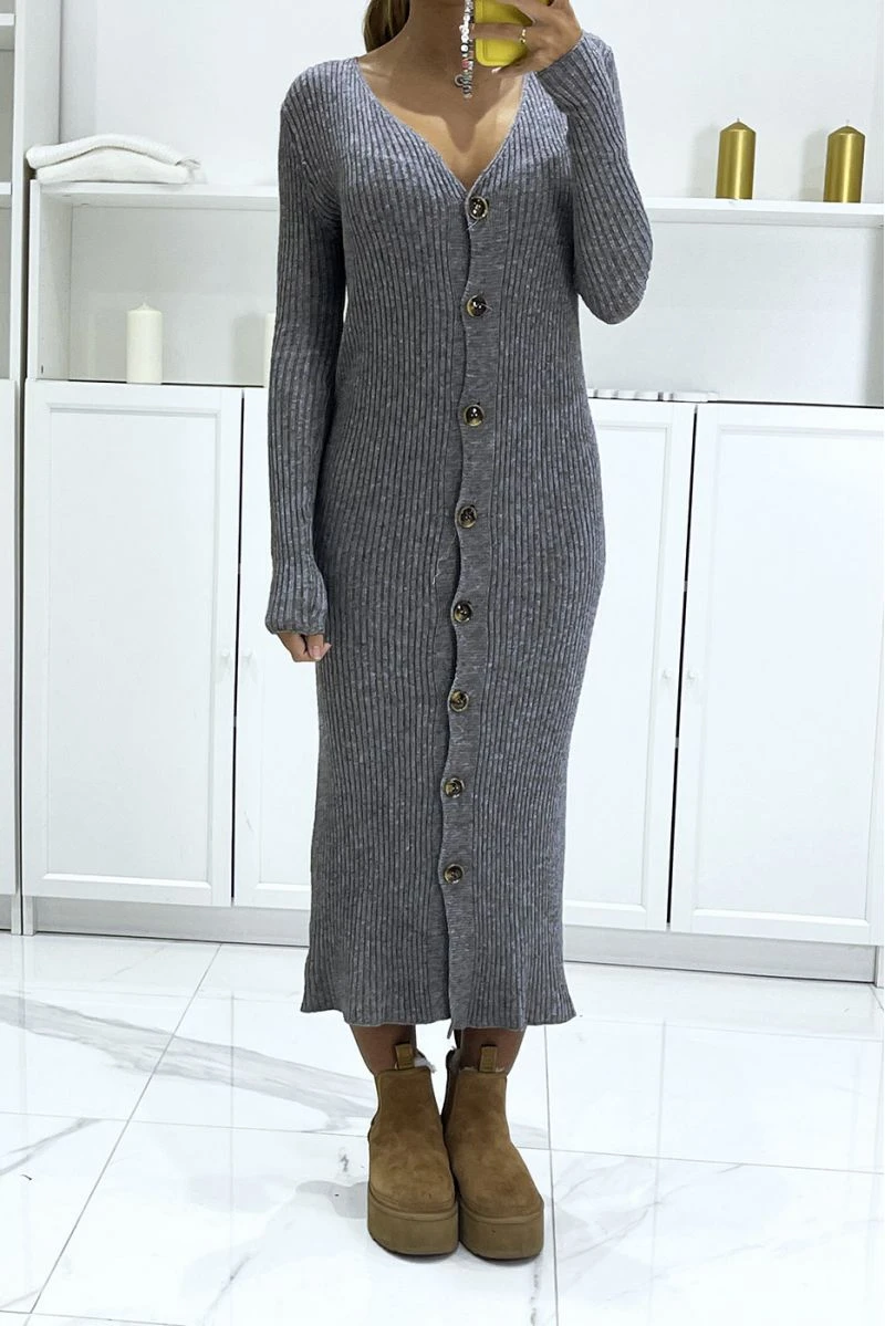 Long gilet anthracite côtelé à fine maille et col v. Gilet femme tendance et très chic