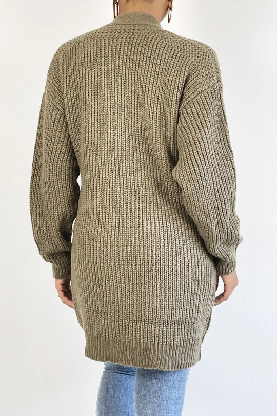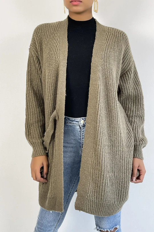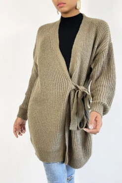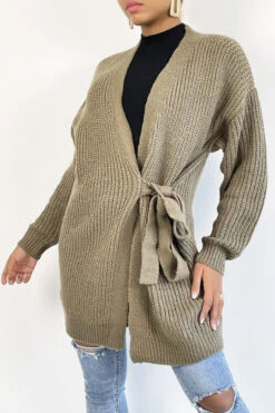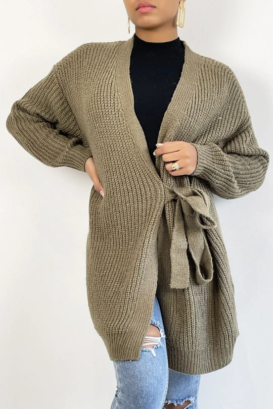Long gilet cache coeur kaki épais avec ceinture intégré. Vêtement mode femme fashion et pas cher