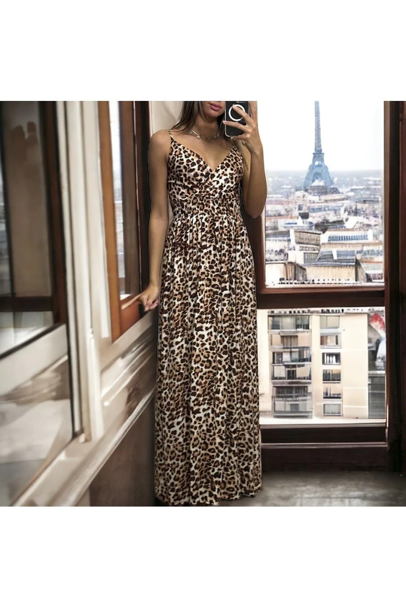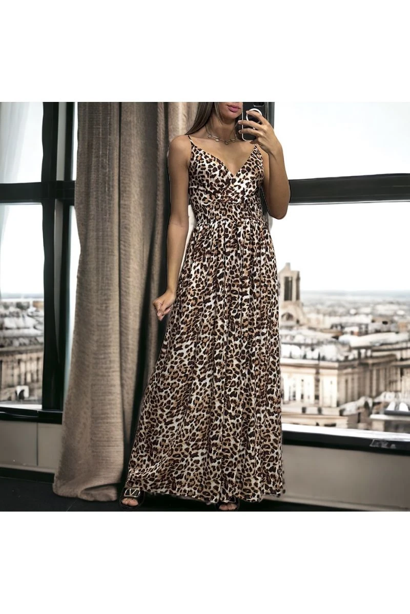 Longue Robe Avec Sublime Motif Léopard Marron Bretelles Amovible