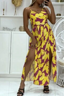 Longue robe jaune et lilas fendue sur les cotés à motifs feuillages hyper tendance