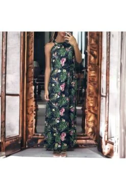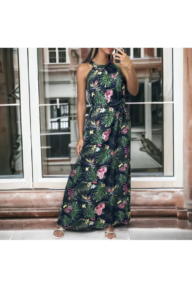 Longue Robe Motif Feuilles Marine Et Vert Avec Ceinture