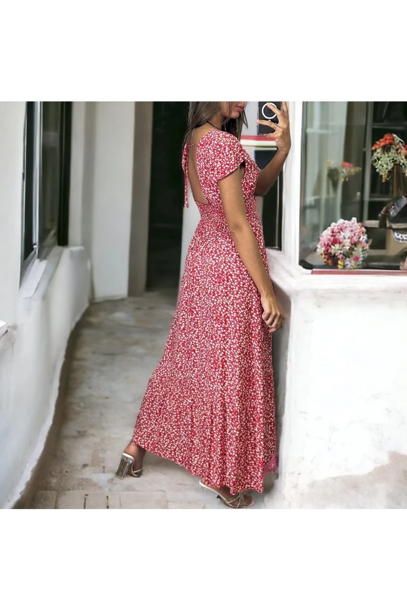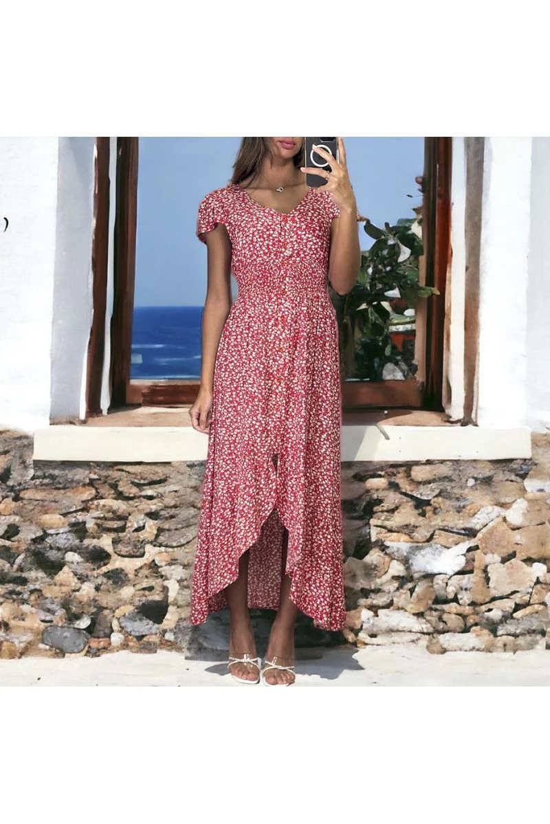 Longue robe motif liberty rouge avec fronce Ă la taille