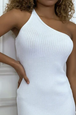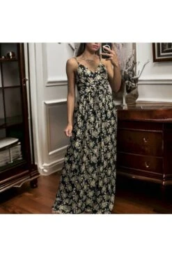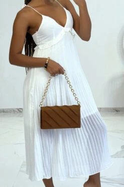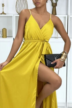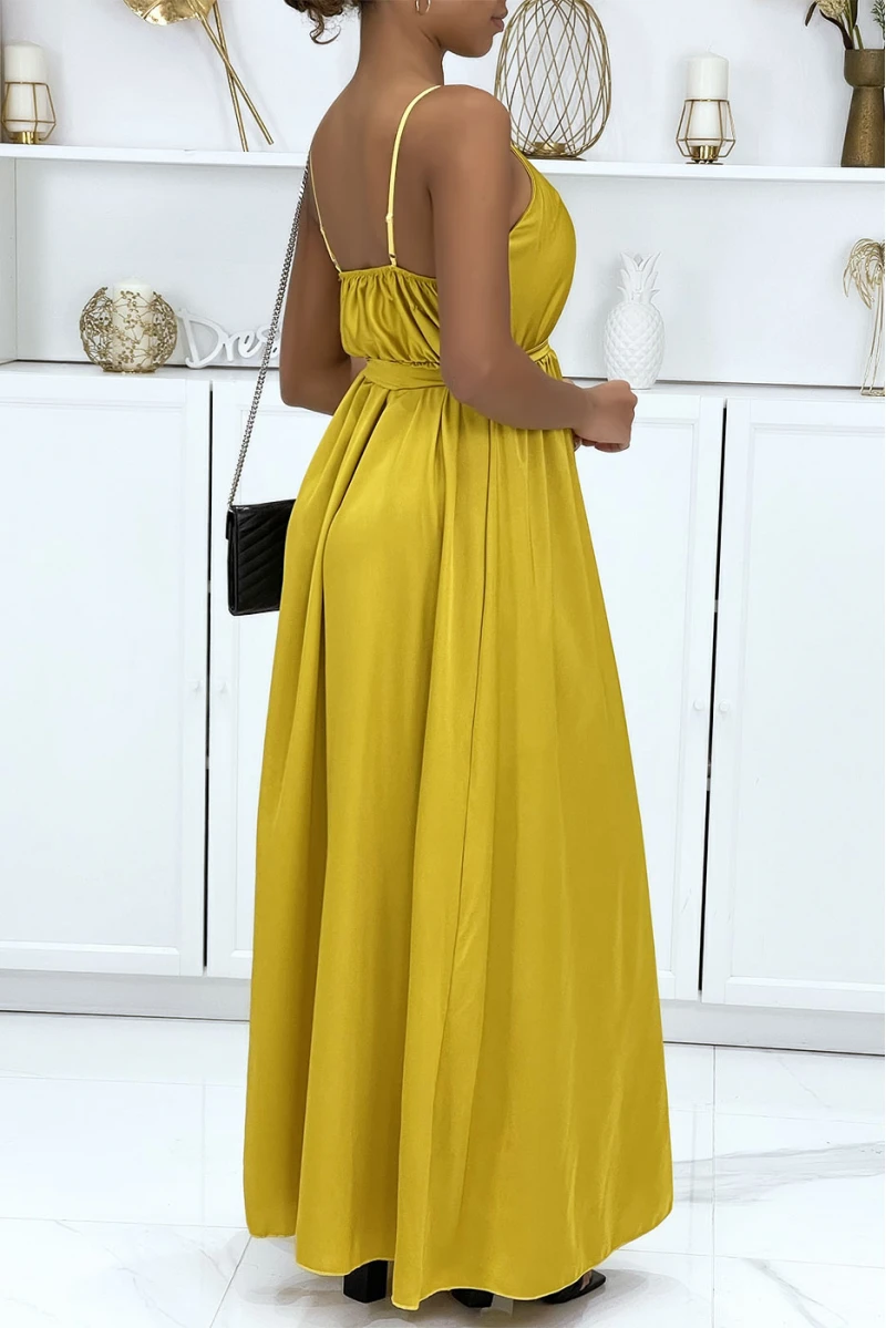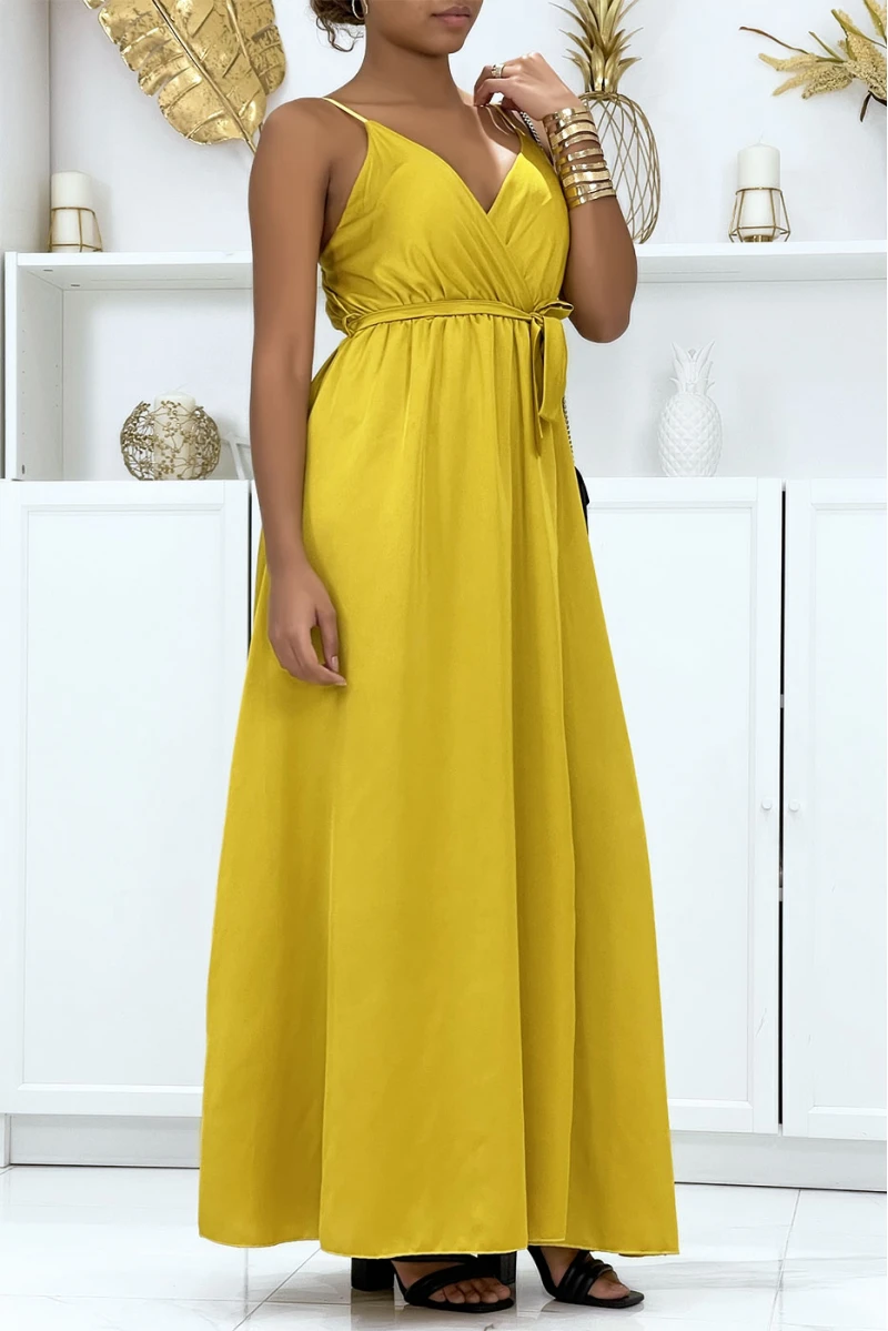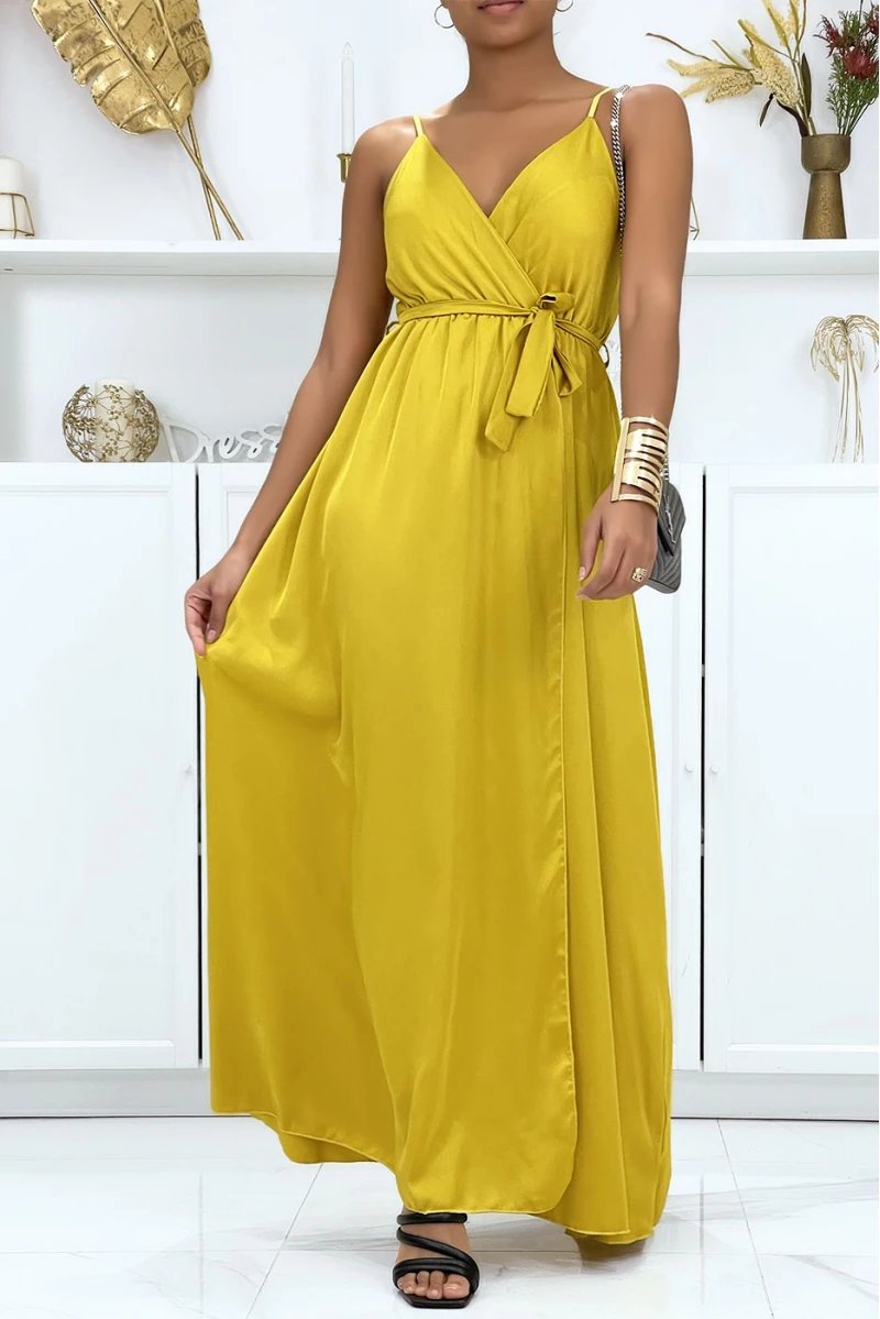 Longue robe satinée moutarde croisé à bretelle. Robe femme très chic pour toutes occasions
