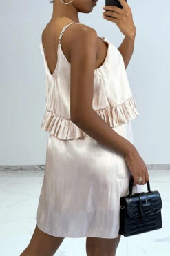 Magnifique robe courte de matière fluide et satinée, à fine bretelles et volants à la taille.