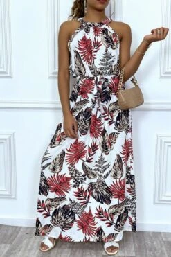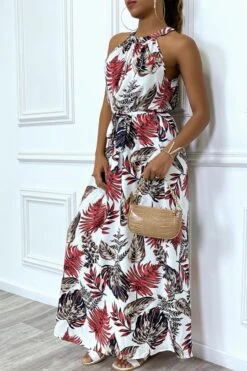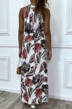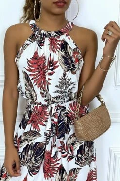 Robe blanche fluide col ras-du-cou / nageur à motifs feuilles et ceinture à la taille