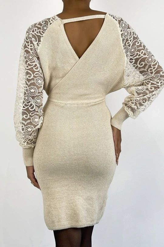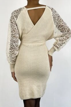Robe cache-coeur beige irisé à manches ajourées. Magnifique robe pull côtelée très chic et fendue à la cuisse.