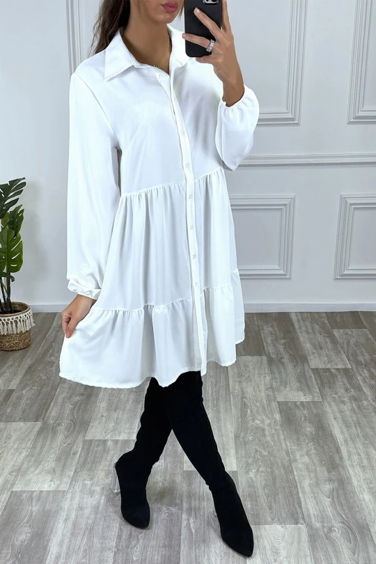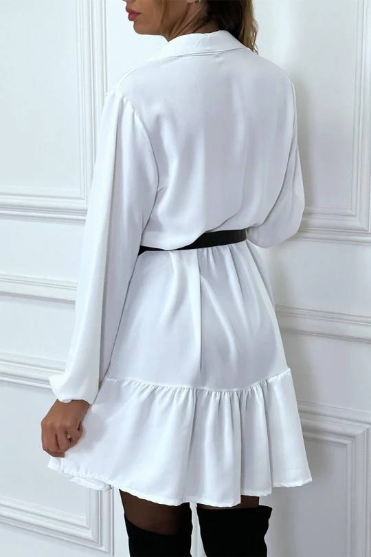 Robe chemise blanche à volant et boutons, froncé sur 2 endroits et manches longues en voilage vendu sans la ceinture