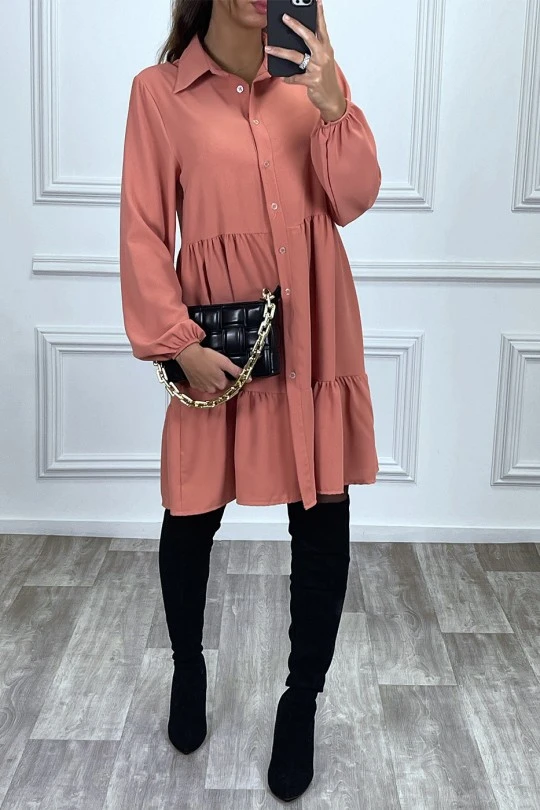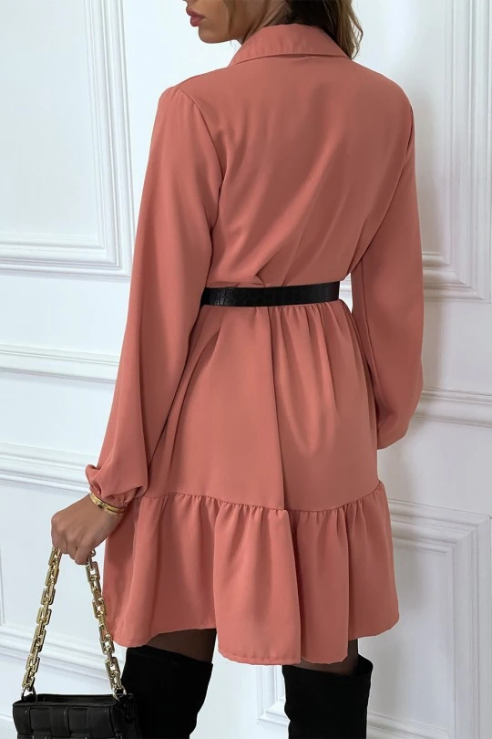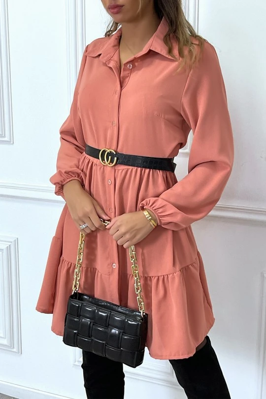 Robe chemise corail à volant et boutons, froncé sur 2 endroits et manches longues en voilage vendu sans la ceinture