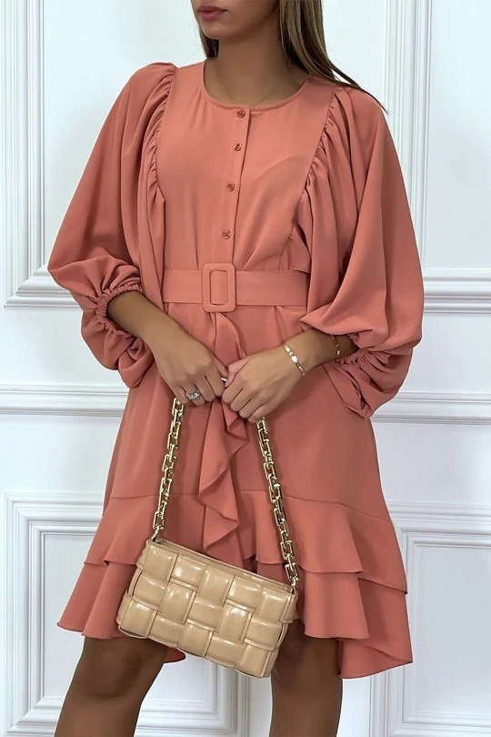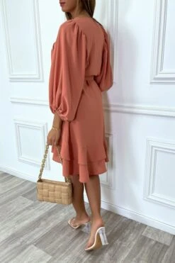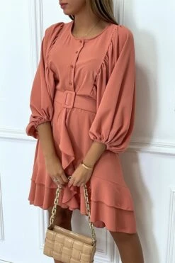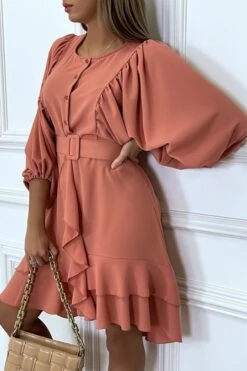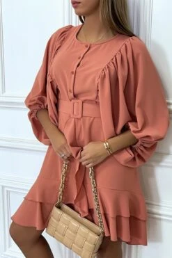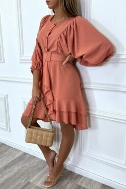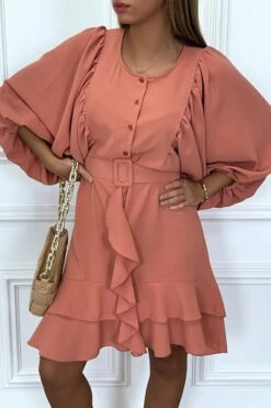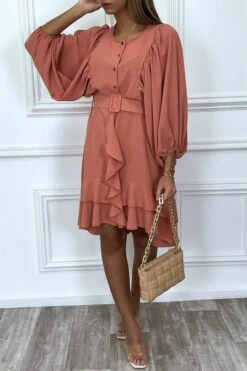 Robe chemise corail avec manches bouffante volants et ceinture. Robe chemise habillĂ© très chic et tendance. Robe femme fashionÂ