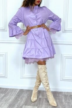 Robe chemise lila avec ceinture volant et dentelle. Sublime robe blanche avec dentelle volant et une belle ceinture camel. Donnez vous vous du style avec cette superbe robe chemiseÂ