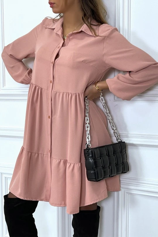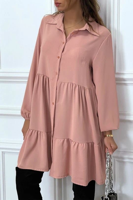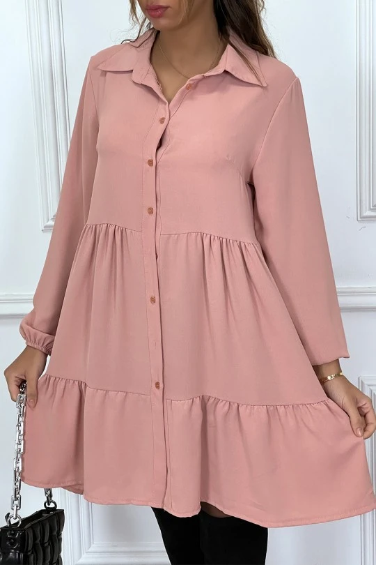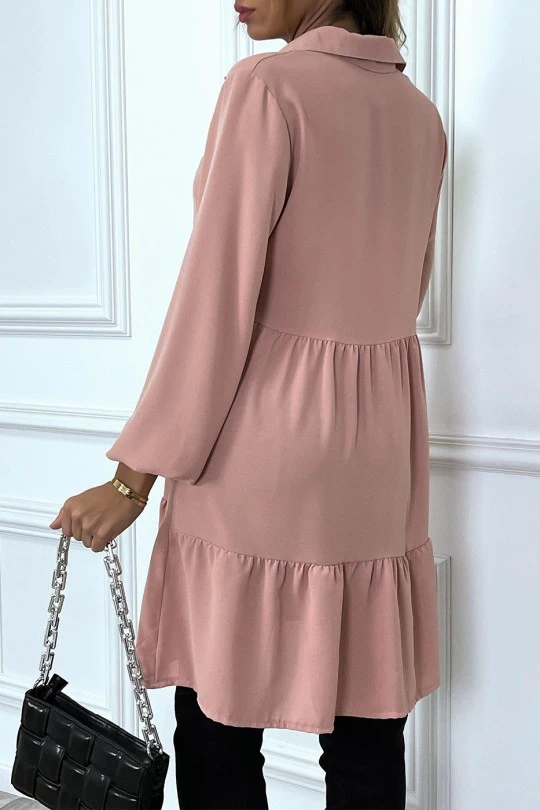 Robe chemise rose à volant et boutons, froncé sur 2 endroits et manches longues en voilage