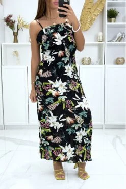 Robe longue noire fleurie d’orchidĂ©es multicolors