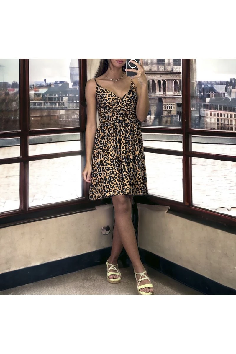 Robe Motif Léopard Marron à Bretelle Froncé A La Taille