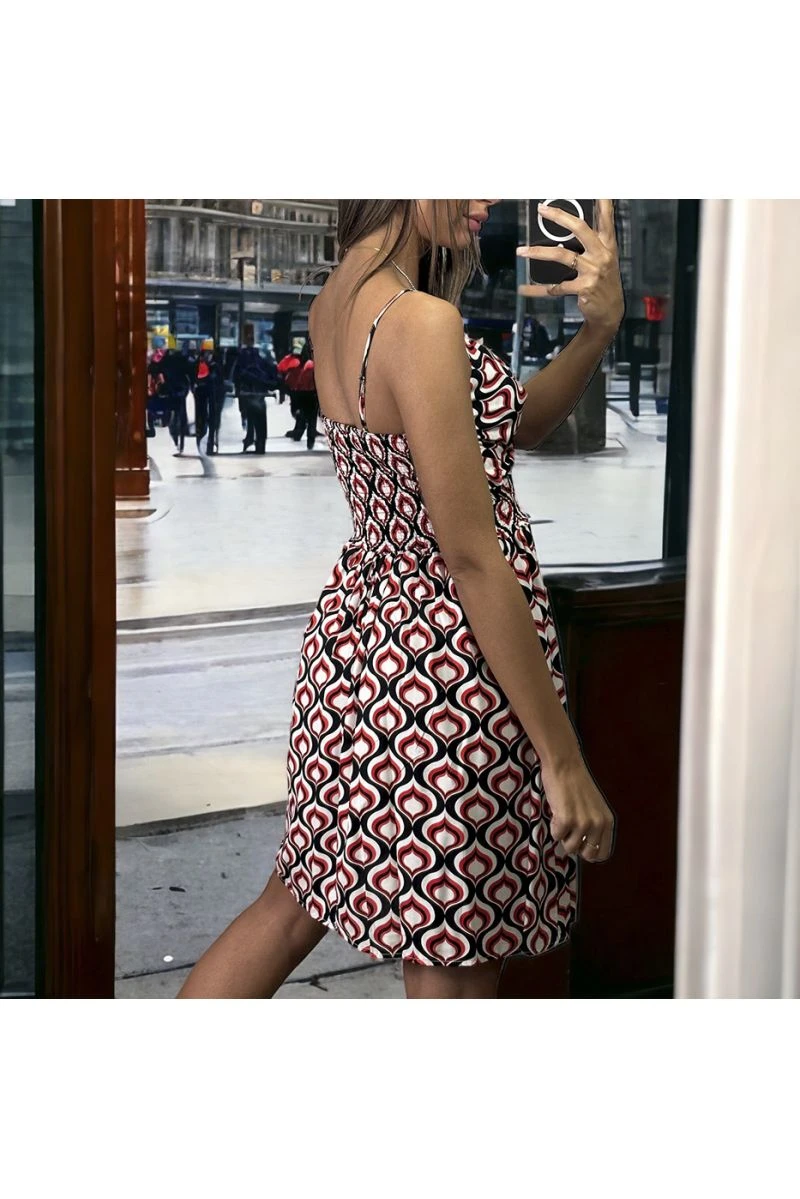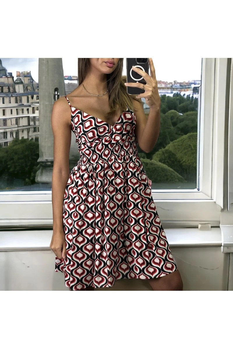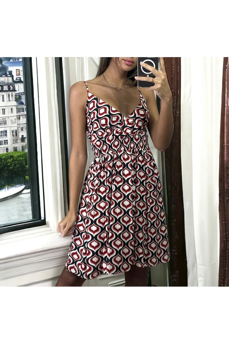 Robe Motif Noir Et Rouge à Bretelle Froncé A La Taille