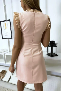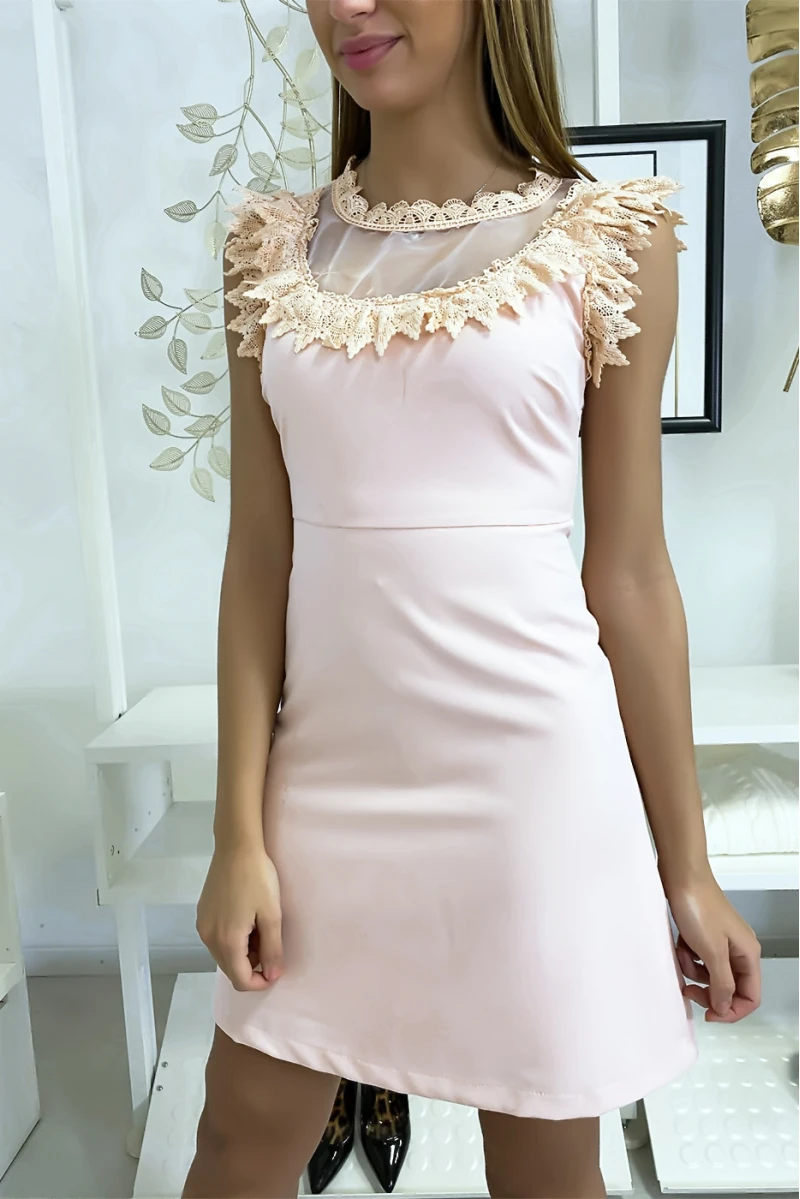 Belle robe rose très chic avec dentelle aux manches au col et au buste. Mode femme pas cherÂ